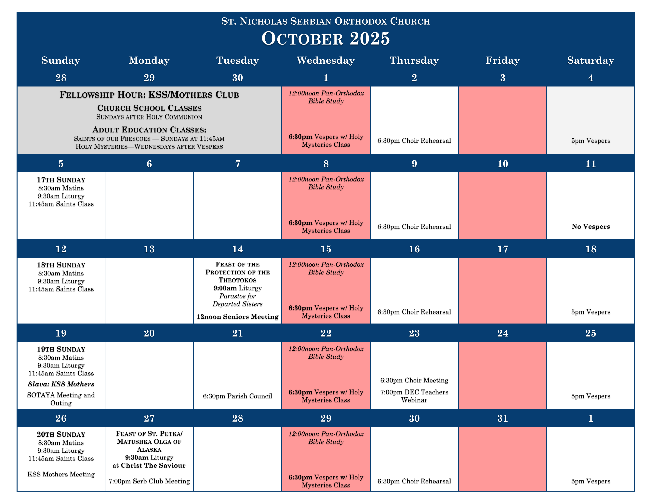 This adult education class explores the history of the Orthodox Church through the lives of the Saints. Class will begin at 11:45am in the Church, giving opportunity to have some refreshments after Liturgy.