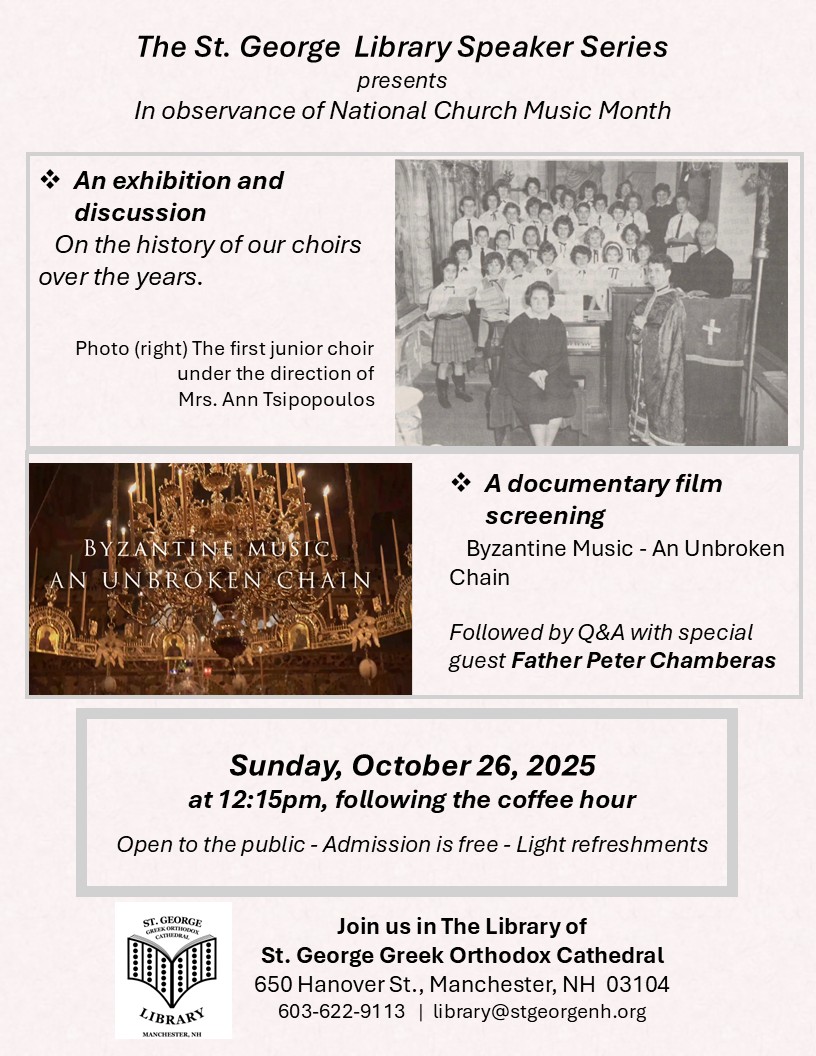 ST. GEORGE LIBRARY SPEAKER SERIES TODAY – In observance of National Church Music Month, the Library is presenting an exhibition and discussion on the history of our choirs over the years. Please join us today at 12:15pm following coffee hour as we welcome Father Peter Chamberas