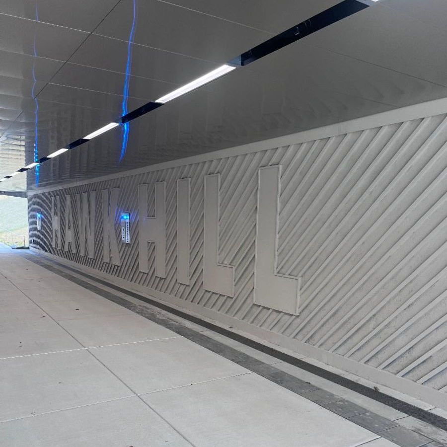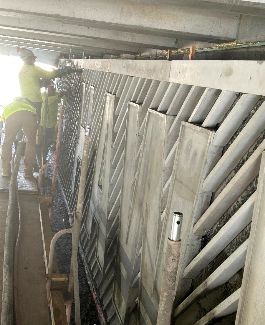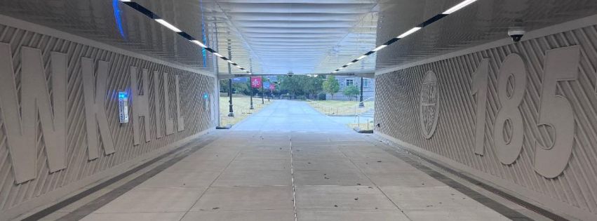 Madison crews recently completed work on the pedestrian underpass, which opened to the public in late September. Our scope included installing a structural shotcrete substrate wall as well as glass fiber-reinforced concrete (GFRC) lettering and graphics that stand out in relief along the wall. The Madison crew also applied shotcrete infill between the GFRC graphics, which resulted in a clean yet textured aesthetic (see images). The underpass design blends with St Joe’s historic stone buildings while the tunnel walls boldly showcase the campus name along with the university’s shield and founding year.