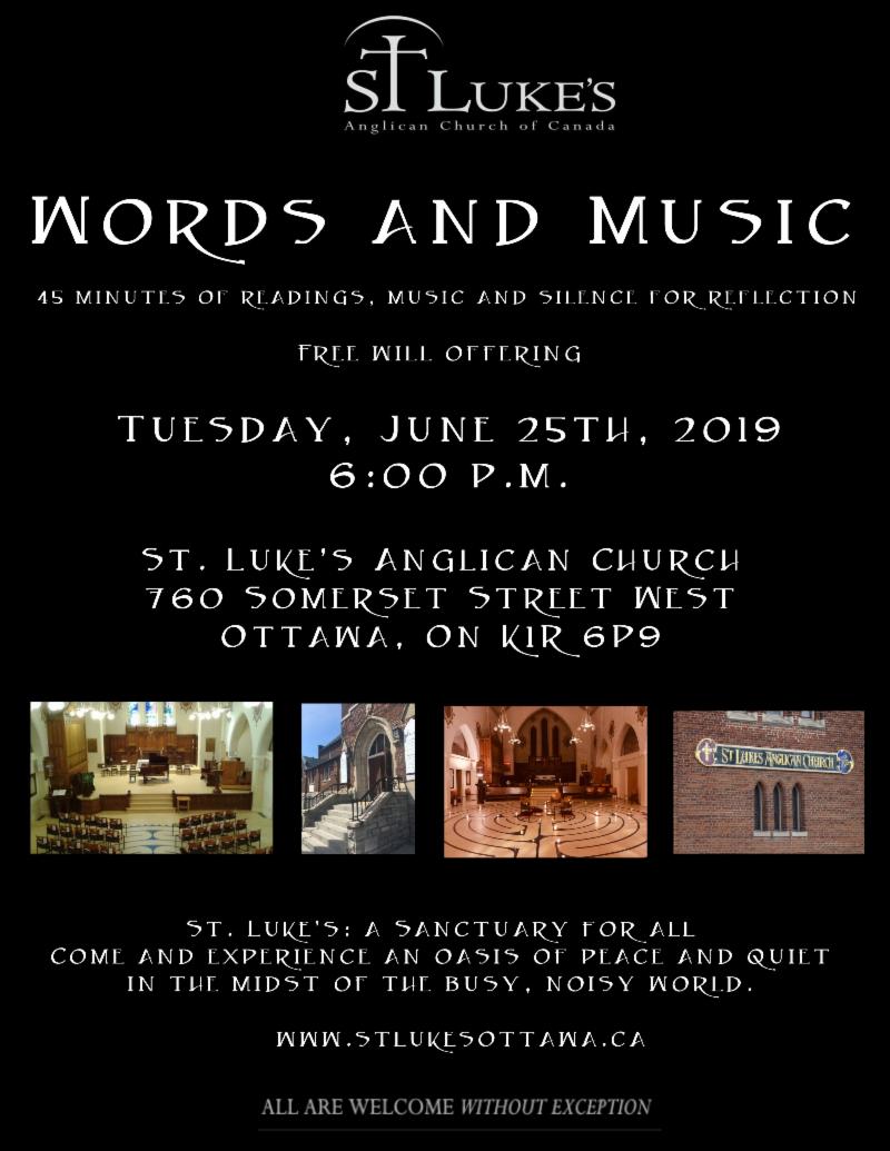 Come and experience the St Luke’s sanctuary as an oasis of peace and quiet in the midst of our busy, noisy world. 45 minutes of readings, music and silence for reflection. The readings (read by Barclay McMillan) are a mixture of poetry and prose, and are not necessarily religious, but are chosen as "food for thought". The music (played by The Reverend Victoria Scott) is offered with a view to creating a relaxing and refreshing atmosphere. Free will offering. More information at 613-235-3416 or