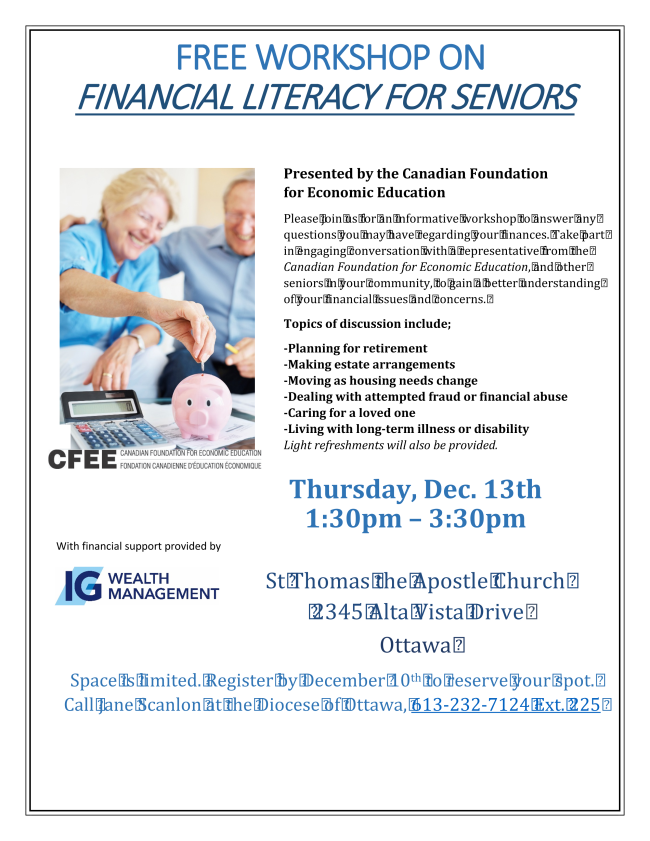 Come and learn about formal and informal pastoral care in the parish, as we move to having a new Pastoral Care Team at St John’s. Verna Nuttel, of the Ottawa Pastoral Care Training Course, will be our speaker and guide.