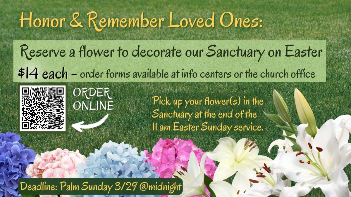 Help decorate the Sanctuary for Easter by purchasing a flower in honor or memory of a loved one. $14 each (cash, check, or card). Hydrangeas and Easter lilies will decorate the Sanctuary on Easter, and flowers may be picked up after the 11 am Easter service. Click here to order a flower in honor or memory of a loved one.