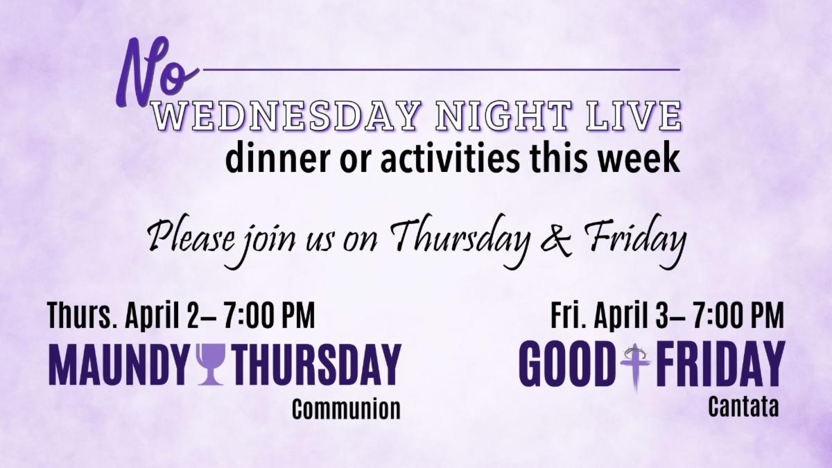 No Wednesday Night dinner or programming this week. Please join us for our Maundy Thursday and Good Friday services (both at 7 pm).