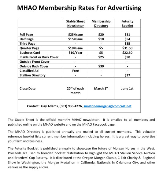 This part of your newsletter is for club requests to members, classified ads, and ways that you can advertise with MHAO. At the bottom you have access to information on your Board of Directors, Board meeting dates, etc. This section also includes important news for MHAO members from other organizations that affect the Equine Industry or that might be important to our members. If we are to be effective in our efforts to preserve and promote the Morgan breed of horse, we need to know what is going on around us.