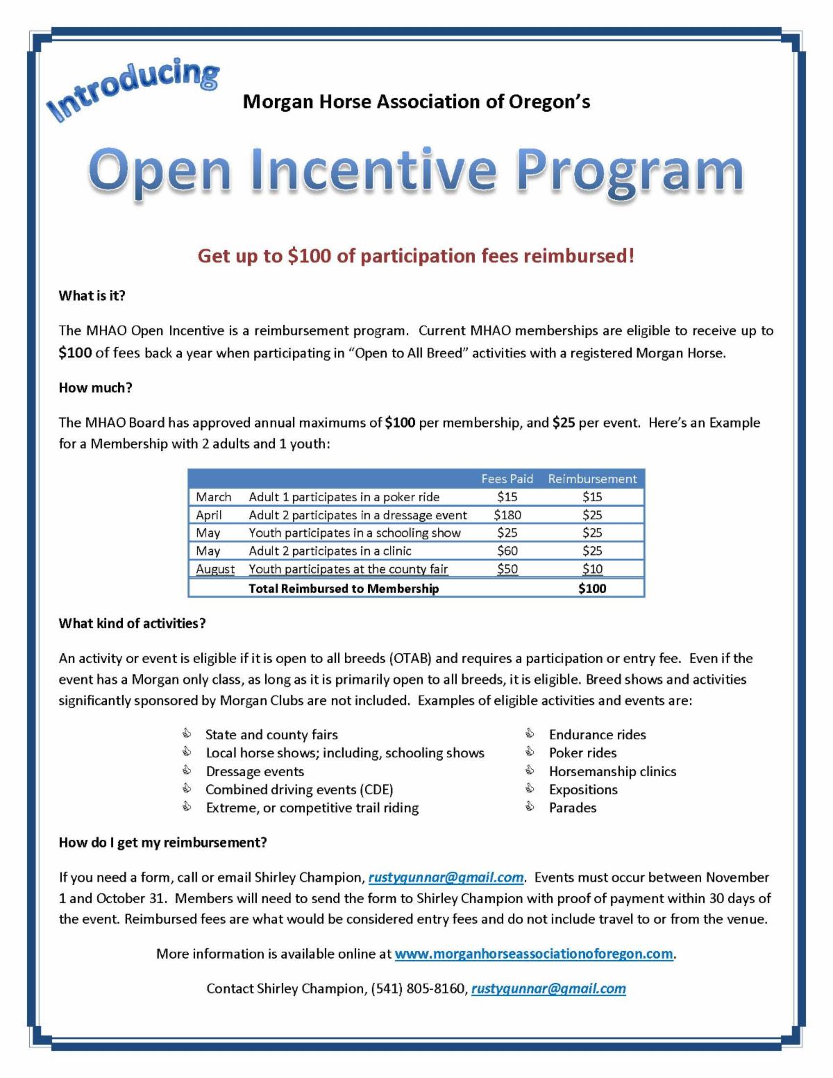 Need a little push to help with the promotion? Here is an additional incentive to get your Morgan out front and center. As a member of the MHAO you are welcome to participate in two member only programs..the Open Incentive and the Ride and Drive program . The Open Incentive program is a reimbursement program. Did you know that you could get back up to a maximum of $100 per year per membership (up to $25 per event) by participating in this program? So, is this only good if you go to a horse show? Glad you asked...NO! Any activity or event is eligible if it is open to all breeds and requires a participation or entry fee. Events such as poker rides, open horse shows, parades, expositions, dressage events etc. are all examples of what is considered a qualifying event! What could be better..getting your Morgan out there AND being reimbursed while doing it. I say that is a win win for all!
