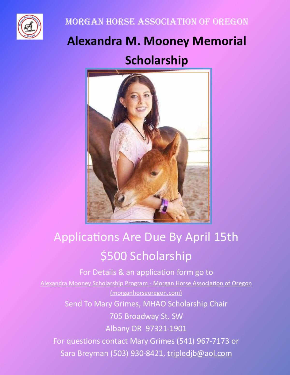 The Morgan Horse Association of Oregon (MHAO) Alexandra M. Mooney Memorial Scholarship is established to promote the values of learning, sharing, leading, volunteering and good sportsmanship inside and out of the arena. We do this by awarding an annual scholarship in any discipline, in equine education, to expand leadership skills, or in any trade. Our goal is to attract new youth to MHAO youth programs, thus promoting a future for our MHAO family.