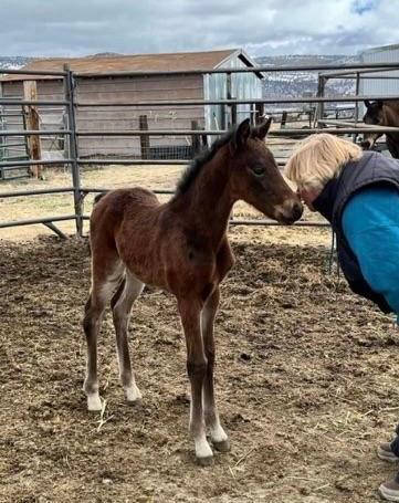 This darling filly is Lily, by Field of Honor and out of Triple S Sunburst. Pictured at three days old with owner Nancy Ann Savage.