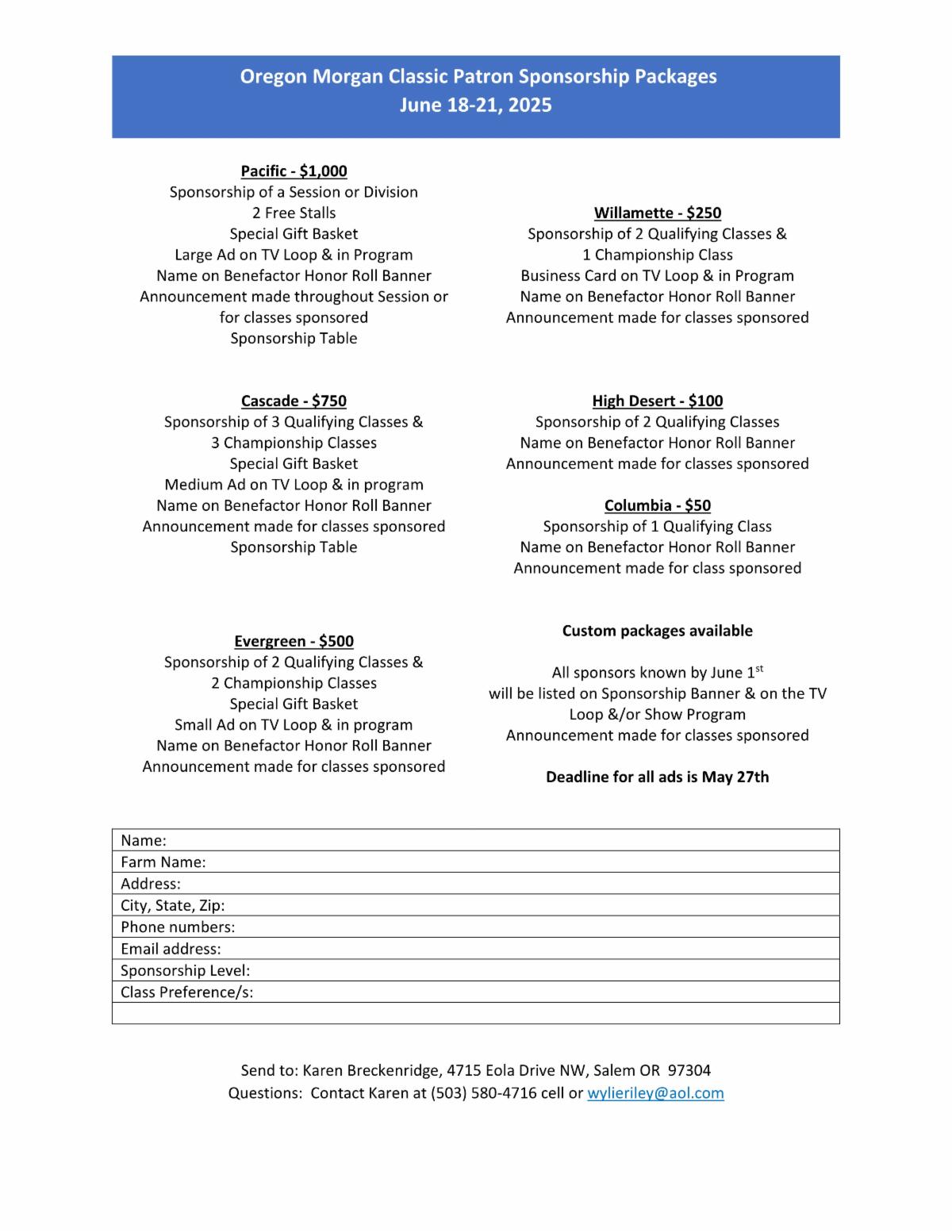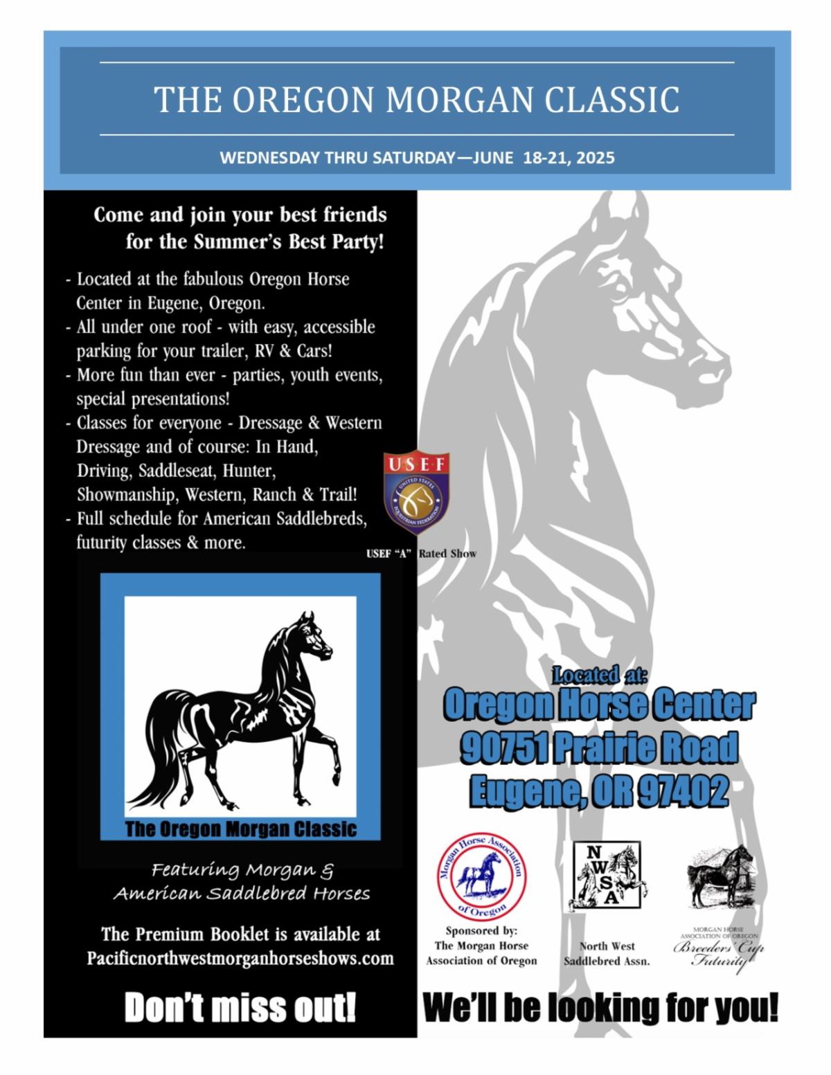 It's time to line up your booth for the Oregon Morgan Classic! Get your reservation for space in now! First come, first to get the best locations. You can pay $25 by the day, or via a Sponsorship of the show.