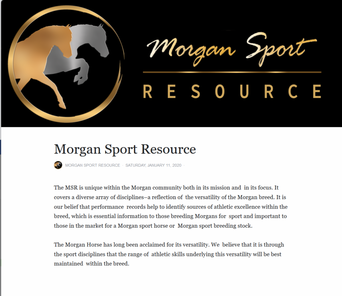 The Morgan Sport Resource (MSR) is dedicated to the improvement and promotion of the Morgan Horse for sport. It collects, summarizes and reports performance data for Morgans and it is a freely available resource for anyone interested in Morgans in sport.