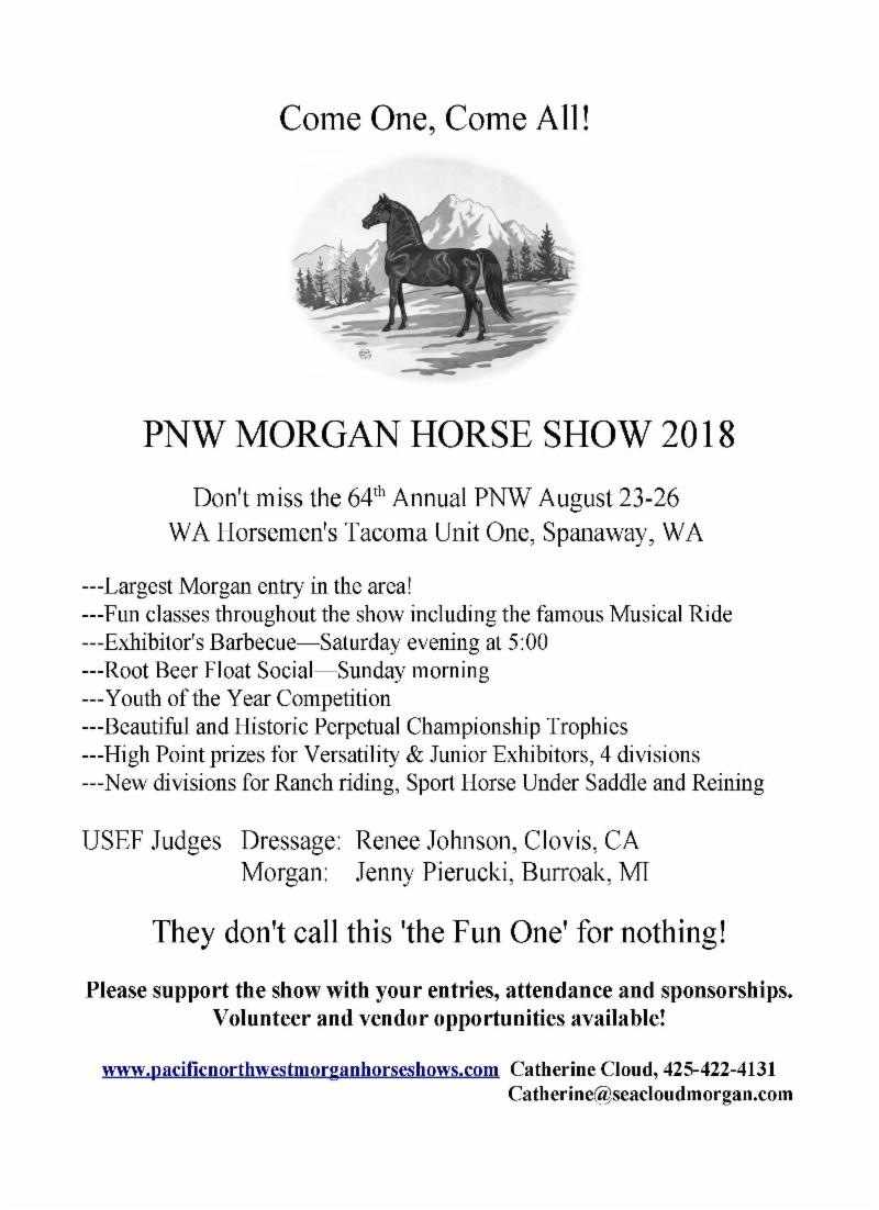 It is with sadness we note that this year's Regional show has been cancelled. Perhaps it is time for the Northwest clubs and show committees to get together and come up with a joint strategy for how to serve our local Morgan Community. We need to help each other if we are to maintain a healthy and energetic Morgan Horse population & community in this area.