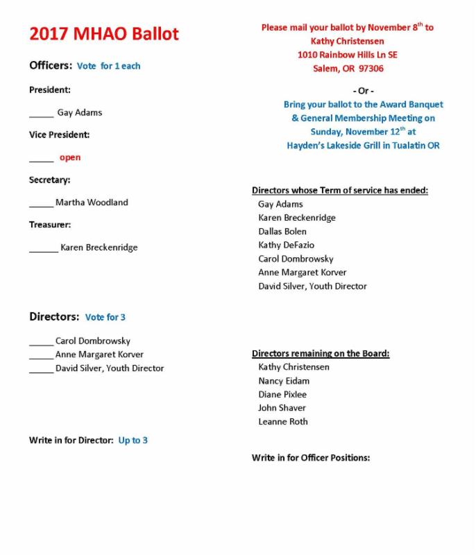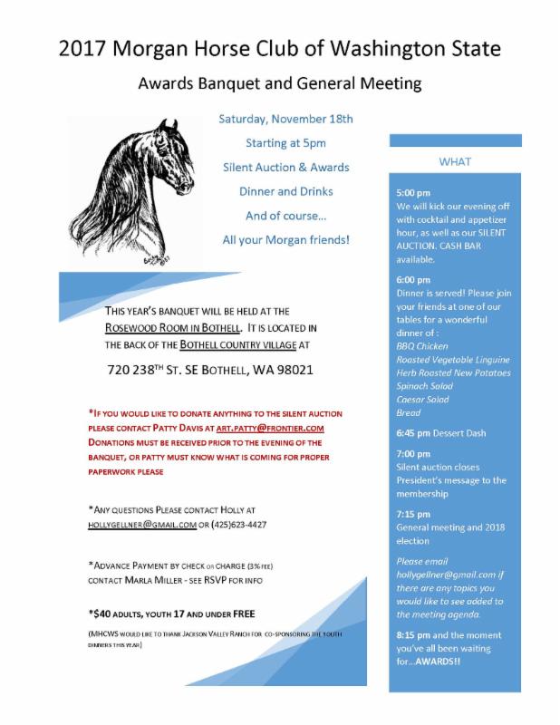 The Board will provide you with a more complete report on the year at the Award Banquet & General Membership Meeting scheduled for Sunday, November 12th, 2017 at Hayden's Lakefront Grill in Tualatin. Look for more information about the banquet later in this newsletter. We have some great speakers lined up to give us information on some of the disciplines that are developing around us. It is important that the Morgan community be up-to-date on the changes affecting the Equine world and on the things our members are interested in. We hope you will be part of the discussion.