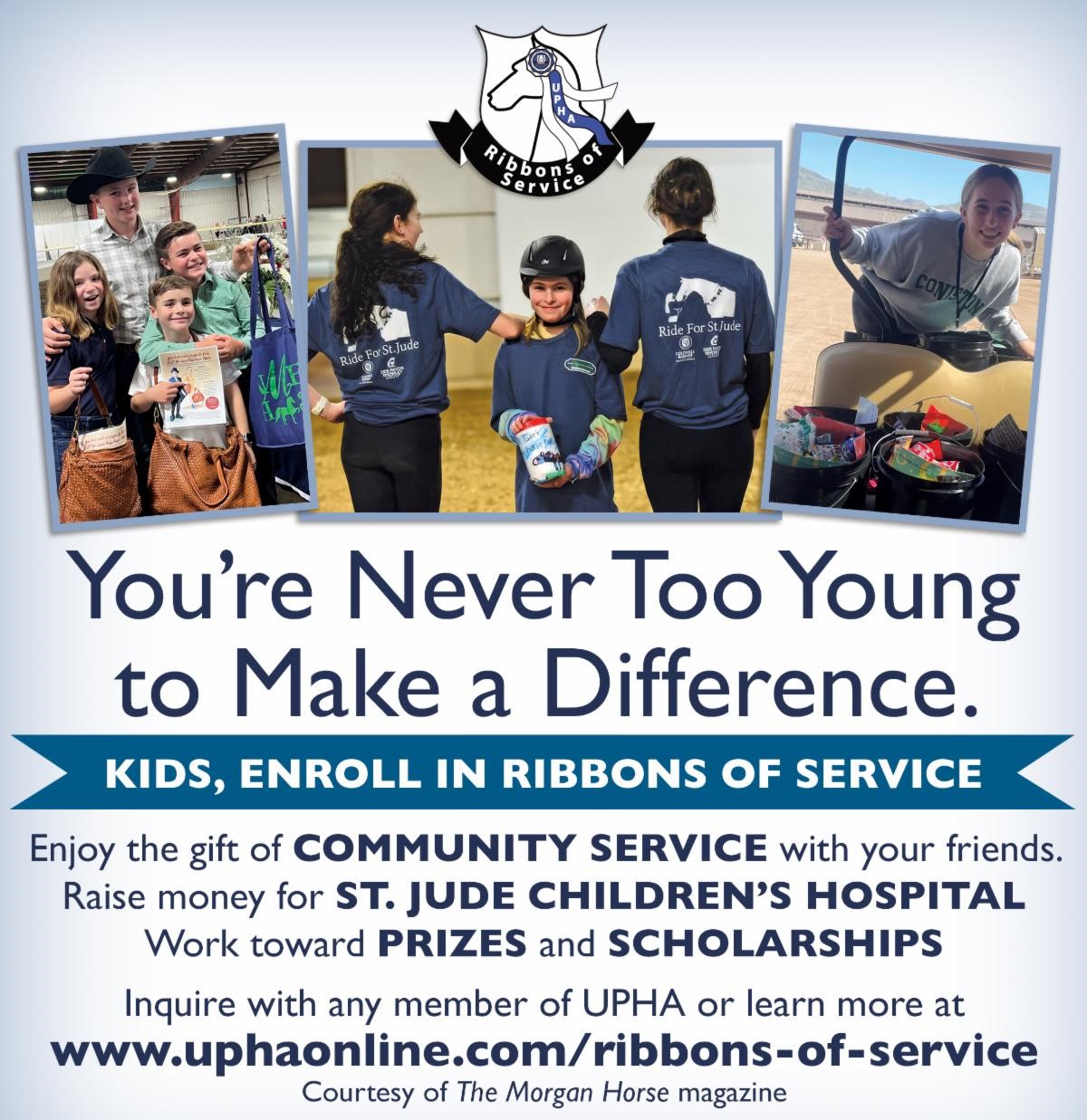 Ribbons of Service is open to all youth members who compete in equestrian competitions in many divisions, including Morgans! Participants in the UPHA Ribbons of Service program have raised thousands of dollars each year for St. Jude and other charities. The program teaches youth members the importance of community service by donating their time to those in need. Through this program, kids learn the value of helping those less fortunate.