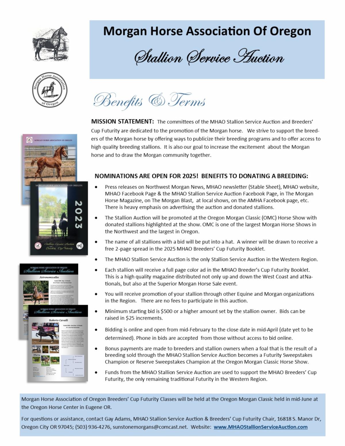 This is a great way to promote your breeding program or foal, and to support the MHAO Futurity. Use this form to enter. For any questions, contact: