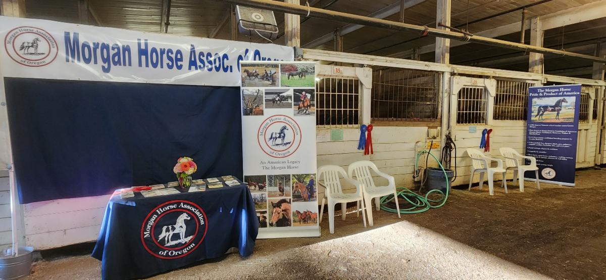 MHAO once again had a promotional table and 2 Morgans were available to represent the Morgan breed at the Oregon State Fair. Kyndle Cummins showed her mare Raindrops on Roses (Reba) and I showed Sangre Island Time (Kona) in the Morgan and Open classes over the weekend. A lot of fair-goers came by the stalls, and Kona was most happy to oblige the "meet and greets" Promotional material was available for anyone interested, as well as "goodie bags" prepared for the kids.