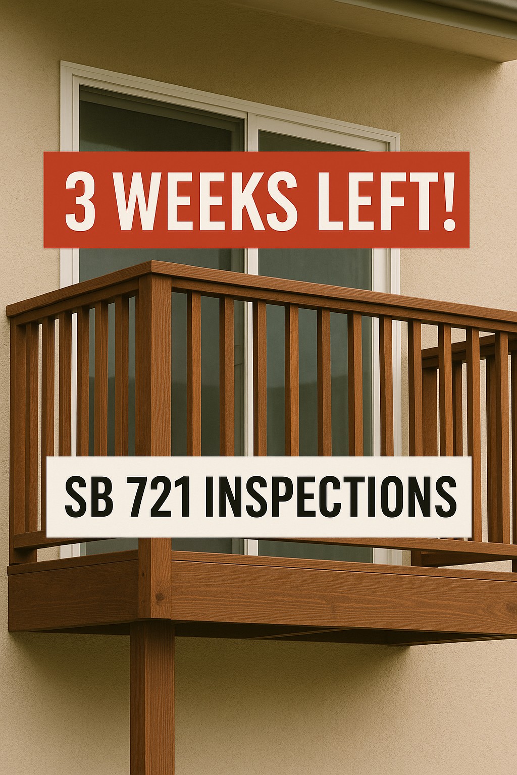 January 1, 2026 is the statewide deadline for the first round of SB 721 balcony and walkway inspections at multifamily buildings with 3 or more units. Many owners are just now realizing that they still need to have their Exterior Elevated Elements (EEEs) inspected and documented.
