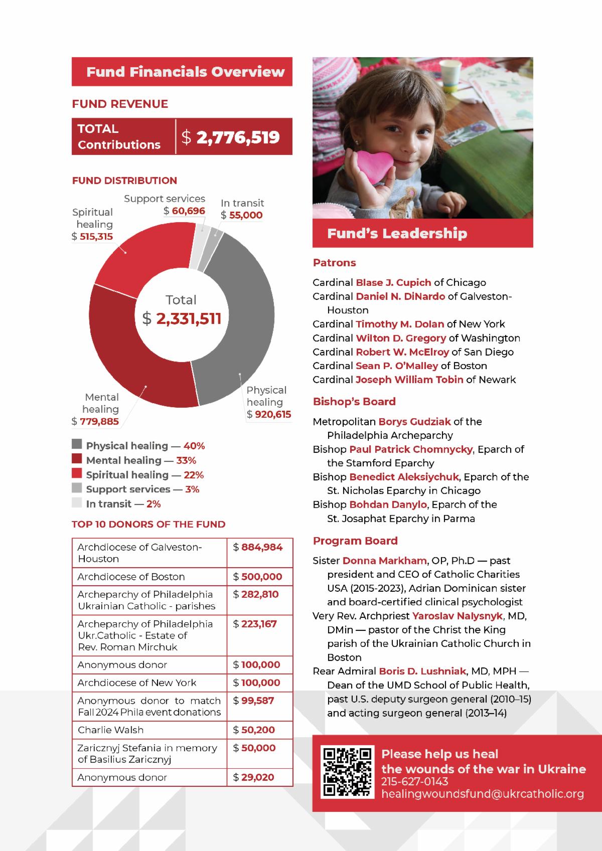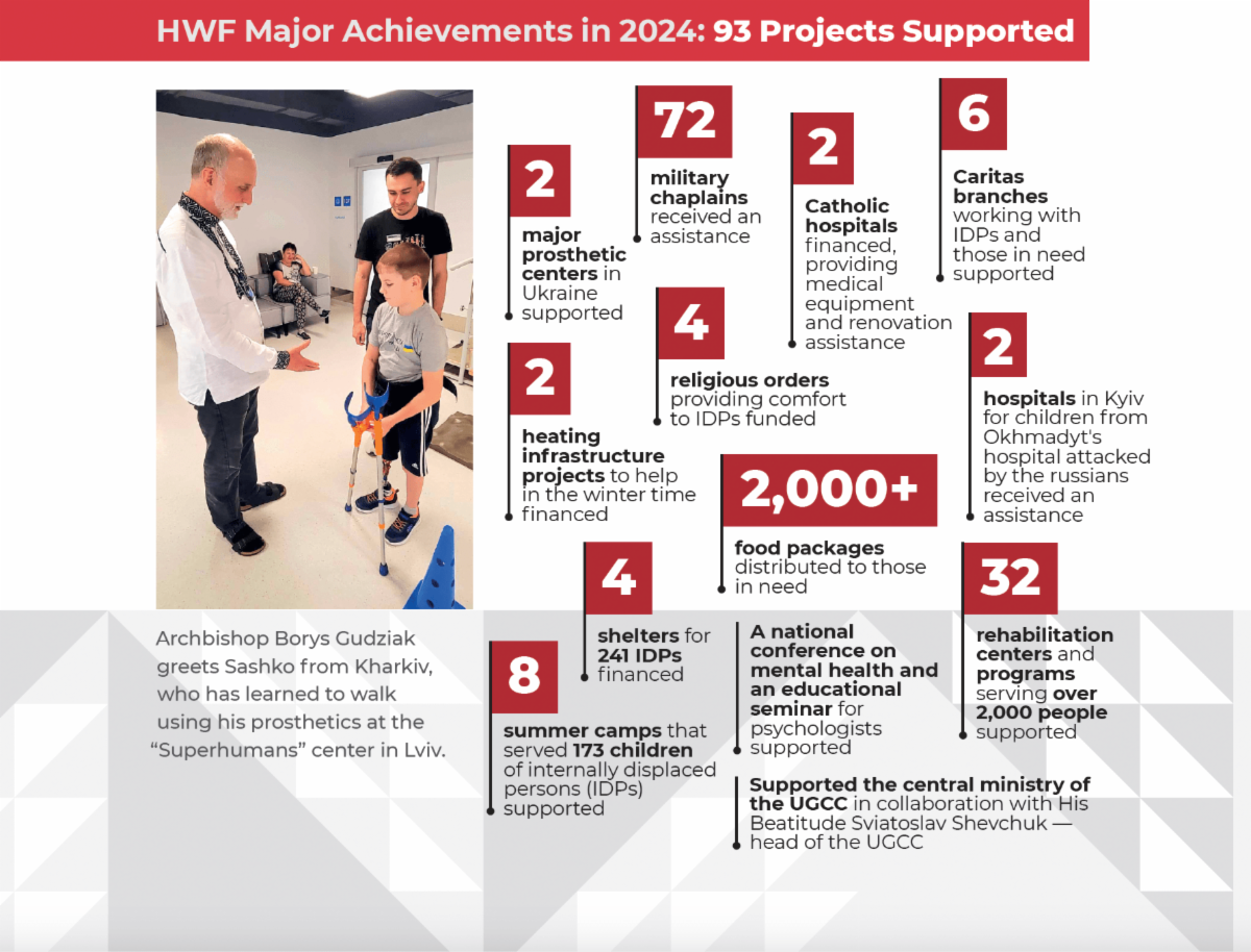 The Healing of Wounds of the War in Ukraine Fund is a part of the Ukrainian Catholic Church in the US humanitarian efforts to support thousands of individuals to bring hope and sustenance at a time of devastating genocidal war. With the trusting and open-hearted mandate of our donors, the Healing of Wounds of the War in Ukraine Fund has distributed over $2.3 million in 2024 focusing on healing of physical, emotional, and spiritual consequences of the war. Overall the Ukrainian Catholic Church in the US through its institutional relief funds distributed over $10 million in humanitarian aid since the full scale invasion had begun.