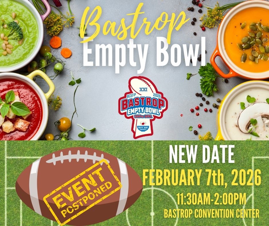 Due to inclement weather, the Bastrop Empty Bowl Project was postponed to February 7th. Tickets include your choice of a handcrafted pottery soup bowl decorated by local school-age artists, plus unlimited samples of soups, stews, and chilis.