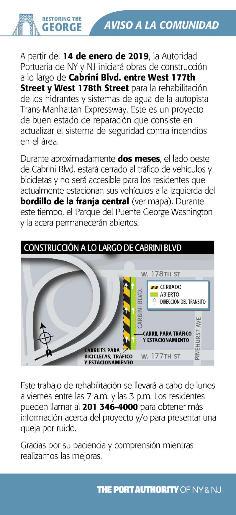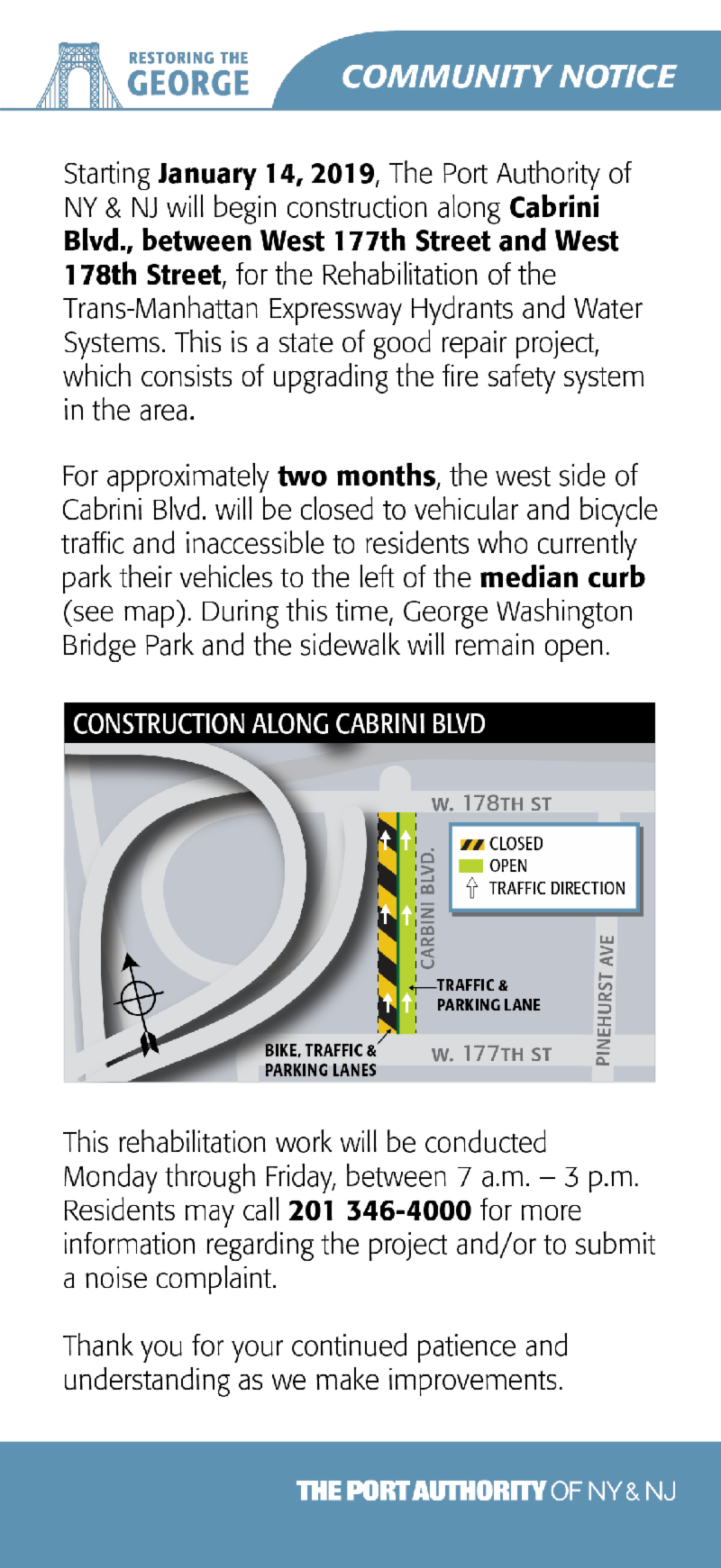I wanted to share with you some important district information. Beginning on Monday, January 14, the Port Authority of New York and New Jersey will begin construction along Cabrini Blvd., between West 177th st. & West 178th St. to rehabilitate the hydrants and water systems along the corridor. Please see the flyers below for more details. The public information line is (201) 346-4000.