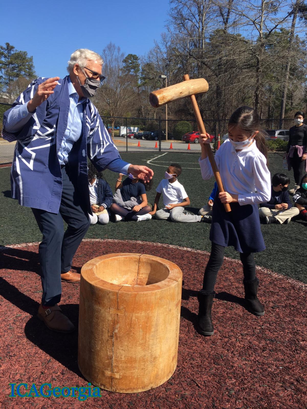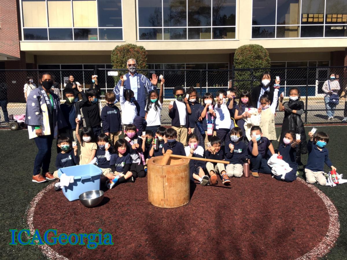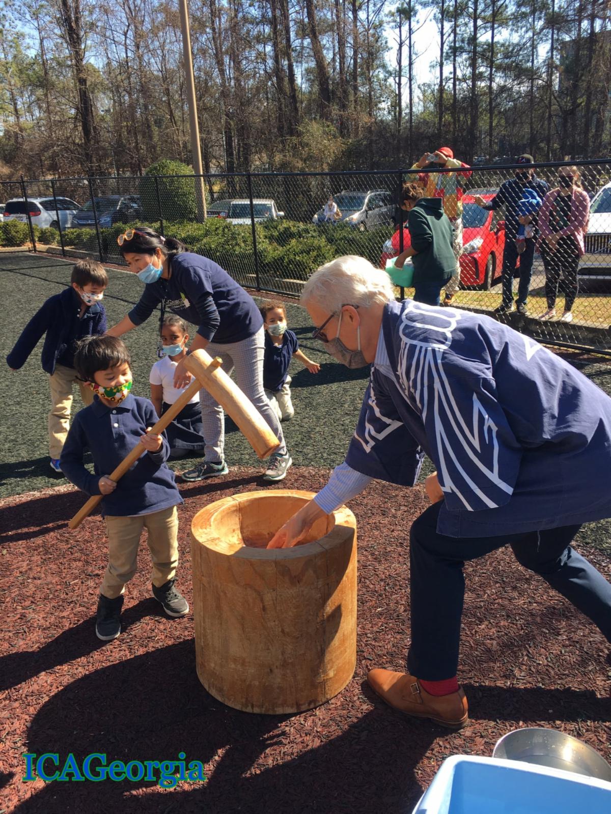 This month, students at the International Charter Academy of Georgia celebrated Mochitsuki, the Japanese New Year Rice Pounding Ceremony. This is a customary ceremony to create and eat rice cakes (mochi). Sticky rice (mochigome) is put into a wooden container and patted with water by one person while another person hits it with a large wooden mallet. Mashing the rice forms a sticky white dumpling. This treat is traditionally made before New Year's Day and eaten during the beginning of January. At the end of this traditional event, students received a slice of mochi to enjoy.