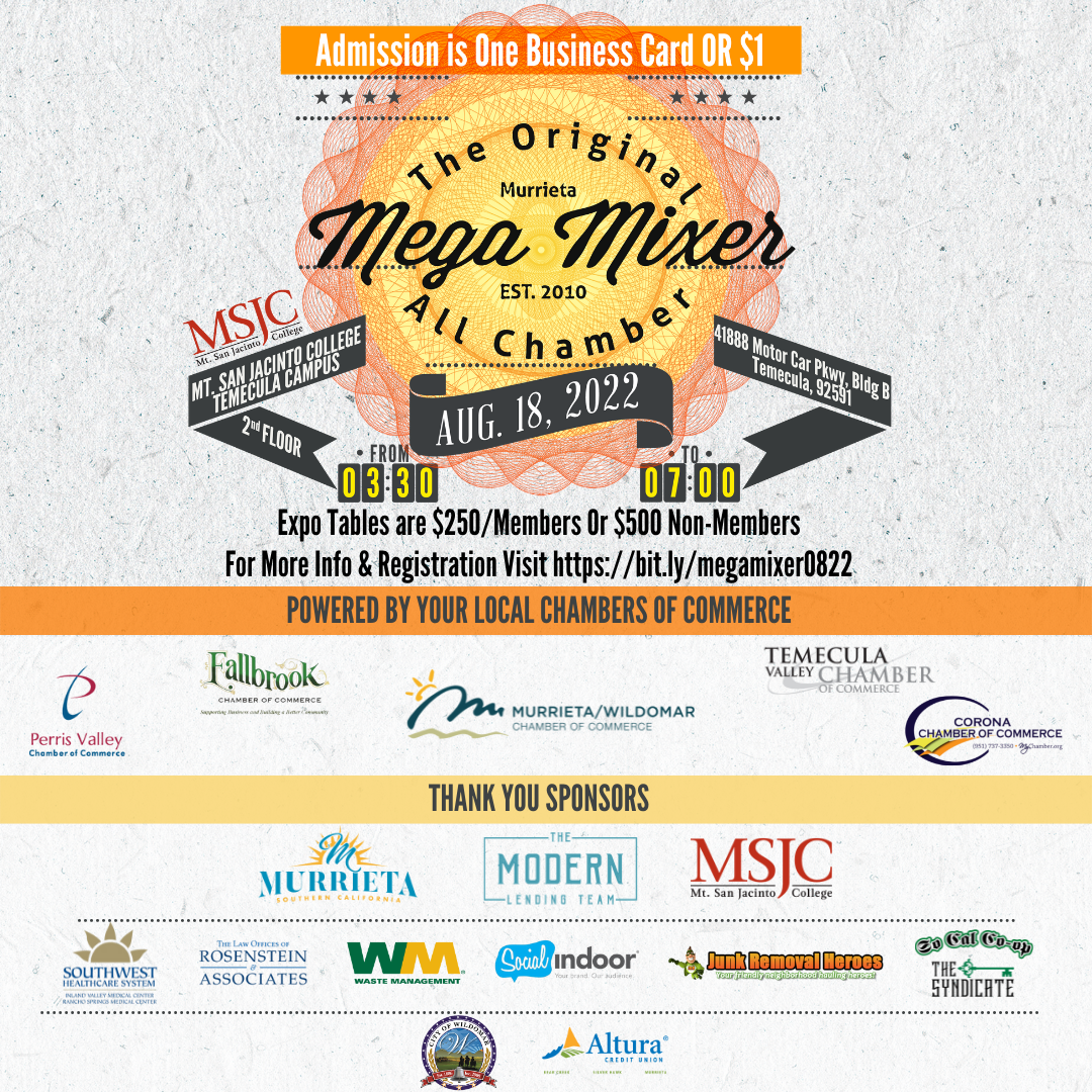 The All Chamber Mega Mixer is back and will take place at Mt. San Jacinto College's Temecula campus. Admission is one business card OR $1. Expo tables are available at reduced prices for chamber members! Choose the Menifee Valley Chamber of Commerce when registering.