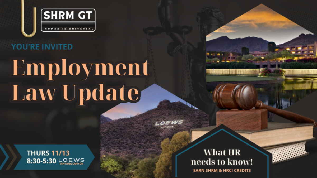 ------SHRM is providing their chamber partners with a discounted rate for SHRM-GT events. OV Chamber members now have the opportunity to attend their annual Employment Law Update at the member rate of $249 (a $200 savings for non-members). This is a full day event focused on the legal and regulatory aspects of the HR operations of a business. There will be plenty of education and networking. The event will be held at Lowe’s Ventana Canyon again this year.