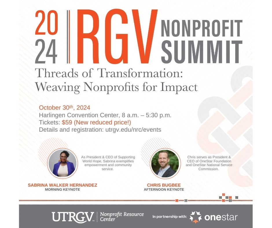 The 2024 RGV Nonprofit Summit, co-hosted by the UTRGV Nonprofit Resource Center and OneStar, will facilitate learning, foster networking, and encourage collaboration within the nonprofit sector in the Rio Grande Valley. Our conference theme, Threads of Transformation: Weaving Nonprofits for Impact, aims to equip attendees with capacity-building strategies and foster meaningful partnerships within the RGV nonprofit community.