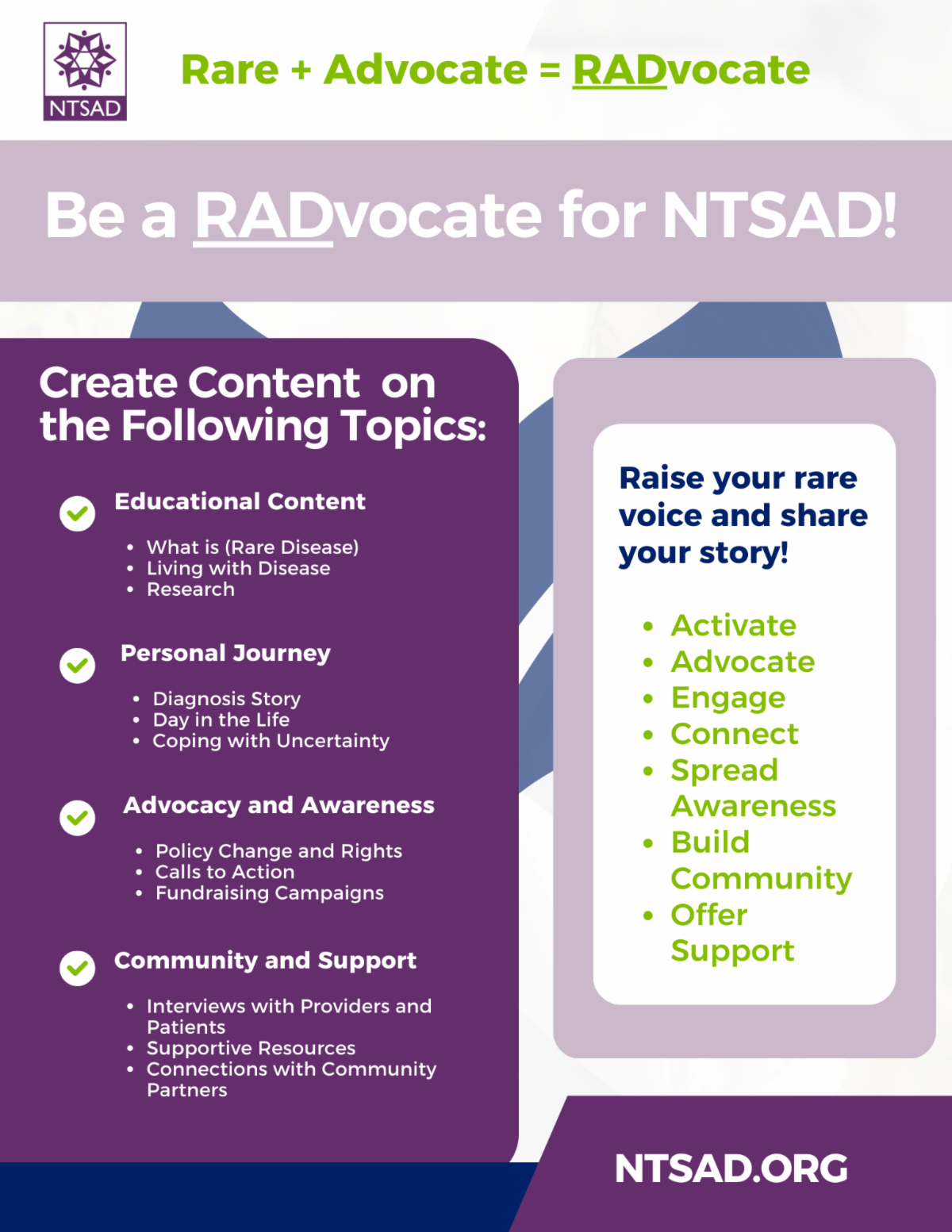 Join us as a RADvocate to raise awareness, share your journey, and help drive change for the rare disease community. Whether you're sharing your story, supporting others, or advocating for research and policy — your impact is real. Email Becky today, at becky@ntsad.org for more information.