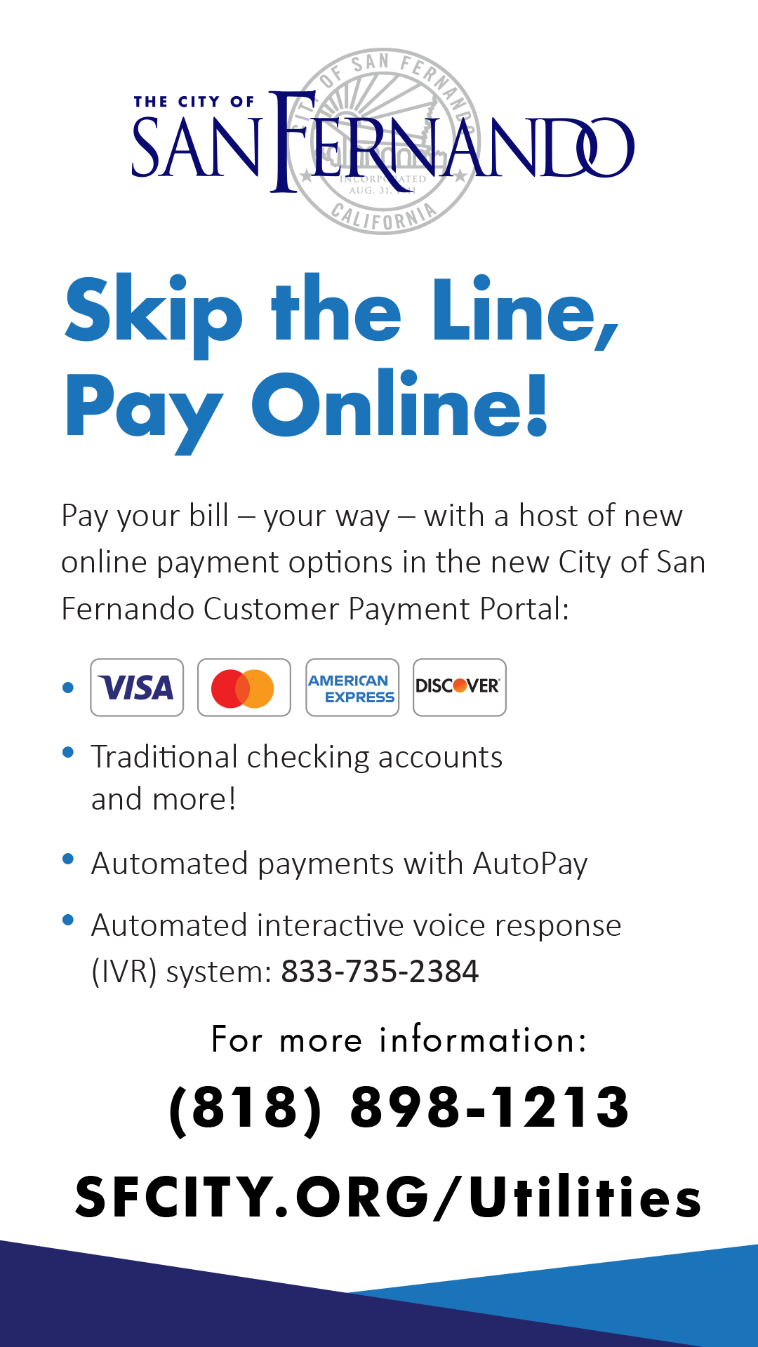 Online Payments: Online bill pay for Water/Sewer Bills services are now available. Residential and Commercial customers are now able to skip the line to kept up-to-date with their accounts. Check out the new City of San Fernando Online Bill Pay: Customer Portal to pay via credit card, debit card, checking account, or AutoPay.