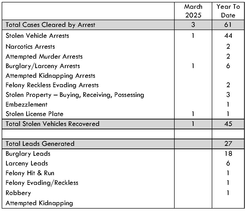 SFPD received a Flock alert for a stolen vehicle near Hubbard Ave and Fourth St. Officers found it near North Brand Blvd, detained the driver, and arrested him for joyriding, meth possession, and a felony warrant for grand theft auto.