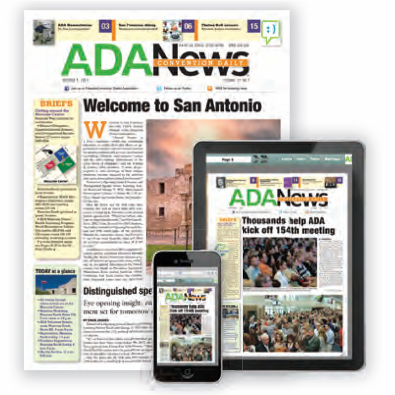 If you are exhibiting at ADA this year, you should know about the ADA News Convention Daily. It is the only official publication of the ADA 2016 Denver Meeting. It is the only publication distributed on-site, handed out at the ADA hotels, on the buses and within the Convention Center. You are assured of quality editorial coverage because it's produced by the ADA News team. By advertising