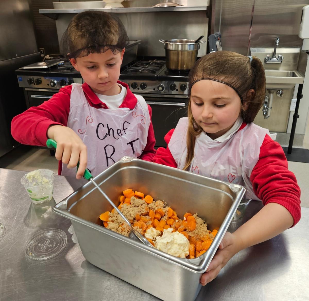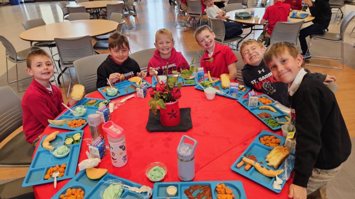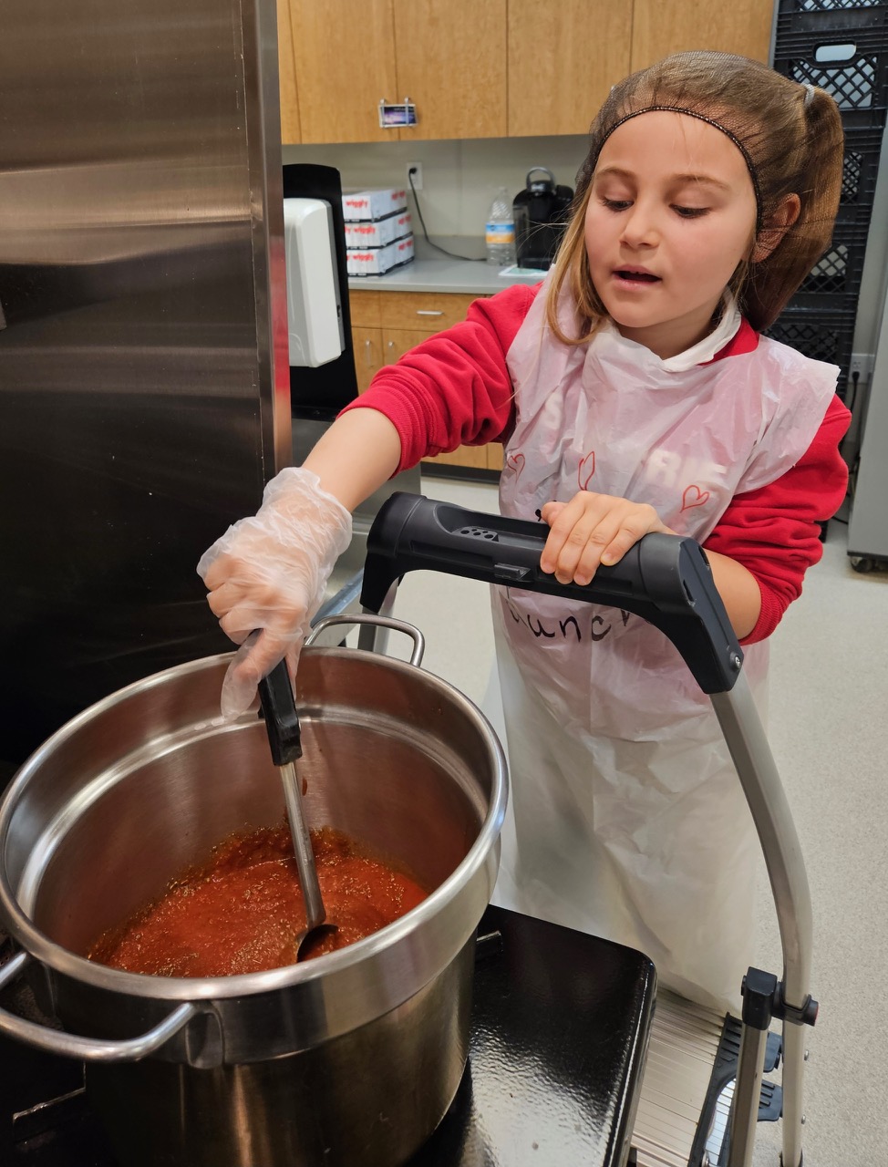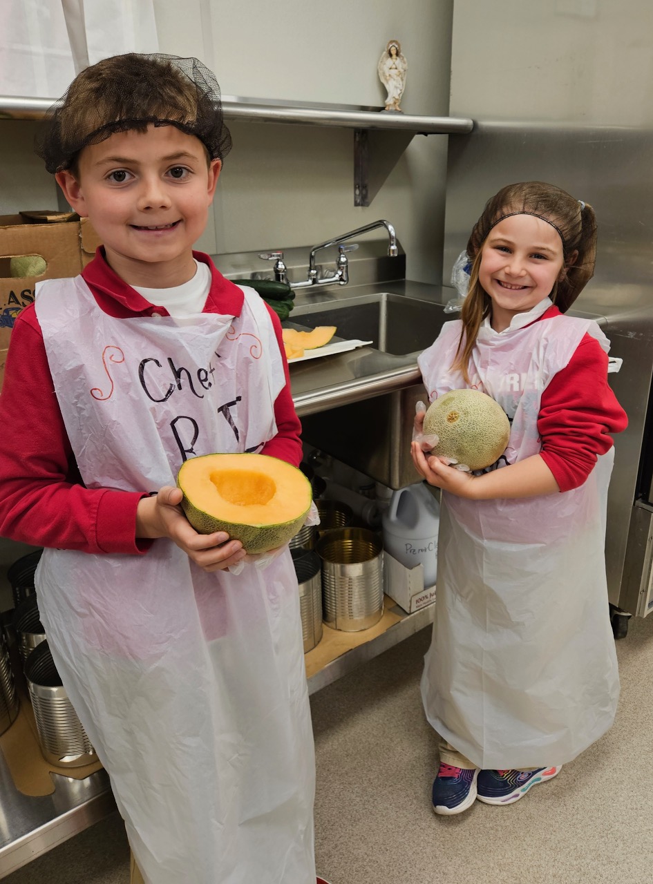 Our lunch director, Mrs. Weyer, had extra special help in the kitchen last week! Two young chefs, first-grader Leona and second-grader RJ, joined her to create and prepare a delicious school lunch for the entire school—an unforgettable experience their parents won at our Parish & School Auction this past March.
