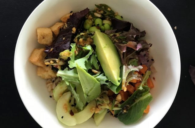 The most flexible way to compose a grain bowl is grain + sauce + roasted vegetables + protein + nuts/seeds + leafy greens + something creamy.