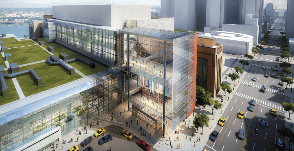 A rendering of the 'new' Javits Convention Center, currently under construction, that will be completed in time for the 2021 New York Auto Show in August. The new space includes an expanded show floor, a rooftop farm, ultra-modern 53,000 sq.ft. event space and a rooftop pavilion overlooking the Hudson River.