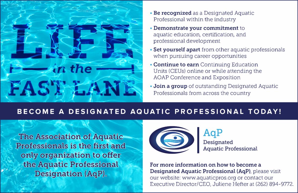 AOAP would like to invite your University to join us in promoting the Aquatic Professional Designation, AqP, to your employees. The AqP program provides recognition and an educational resource to your employees. The AqP Designation identifies those who have made a commitment to aquatic education, certification, and professional development. Through the AqP designation, aquatic professionals in your organization can set themselves apart and be recognized for their professionalism and achievement. By providing AqP information to your employees, it enhances the professional development opportunities your organization promotes and benefits your aquatic professionals.
