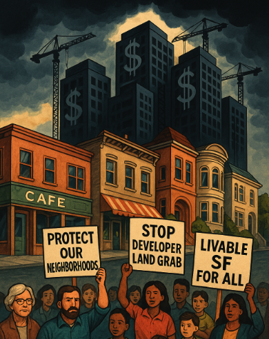 Mayor Lurie's proposed map was drafted behind closed doors. It would lock in permanent changes to height and density laws that ignore what makes neighborhoods livable. It encourages speculation, drives out renters and small businesses, and gives developers a blank check to build luxury towers that serve investors, not residents. San Francisco’s workforce and the next generation need affordable homes, not assets for global capital.