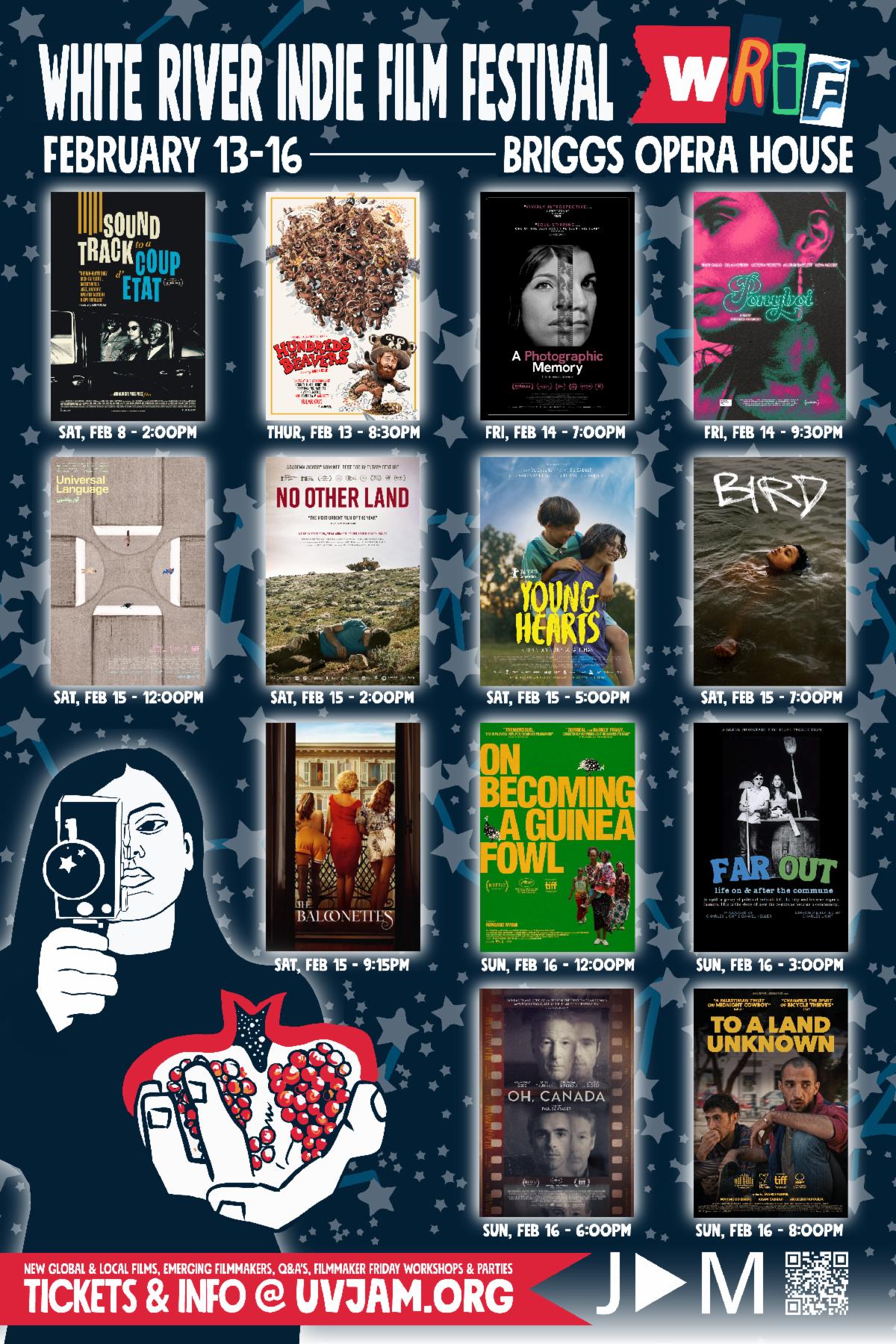 | Come in from the cold for bold new global indie films, thought-provoking documentaries, exciting new works by local filmmakers and Emerging Filmmaker winners, immersive media exhibits, Q&A's with filmmakers, workshops, comedy and parties (of course) at WRIF 2025, returning to the Upper Valley for our 20th year February 13 - 16. Hosted by JAM at the Briggs Opera House in downtown White River Junction, VT and co-presented by the Leslie Center at Dartmouth and Bio X Cell, this year’s festival promises to ignite hearts and minds as intertwined forces for change and connection. Find the full line-up and ticket info below, and don't miss Feb. 8 pre-festival special screening with Hop Film and Feb. 12 WRIF Comedy Benefit Show at the Briggs ! | | |