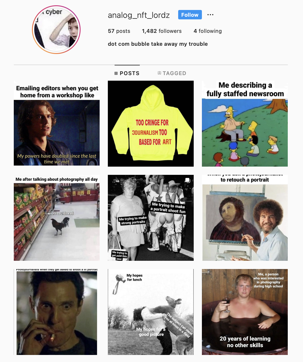 7. Is @analog_nft_lordz our industry's Lady Whistledown? You can try to solve the mystery of their true identity…or just enjoy the funny photo memes.