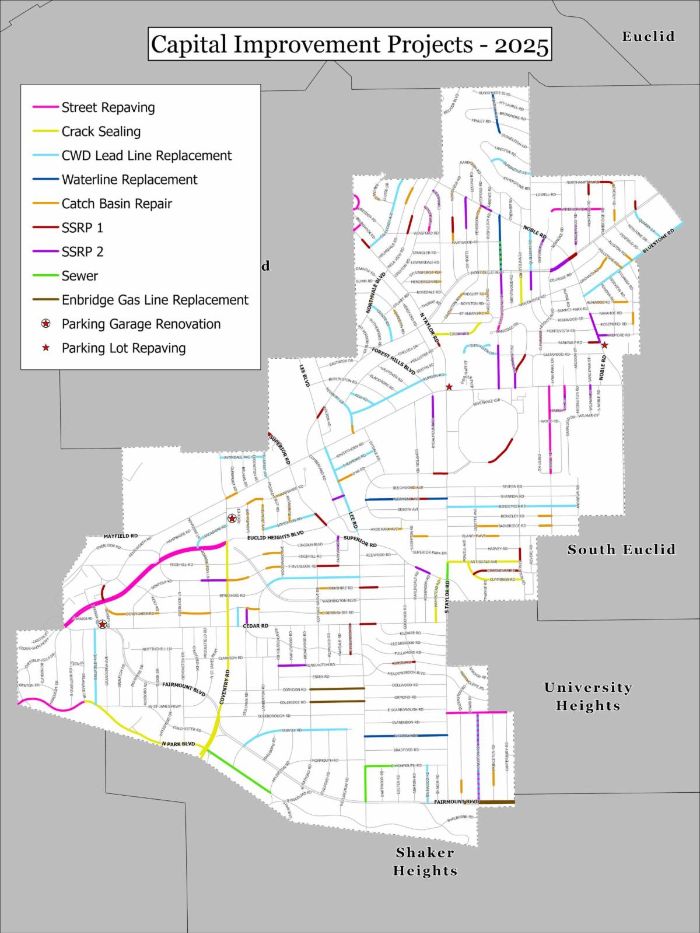 North Park, Maple, Parkhill, Yellowstone, Northampton, Bayreuth, Hanover, Goodnor, Marlindale, East Scarborough, Kingston, Whitby, and Euclid Heights Boulevard—the city's road contractor has completed final paving on these roadways. Final striping of the roadways remains.