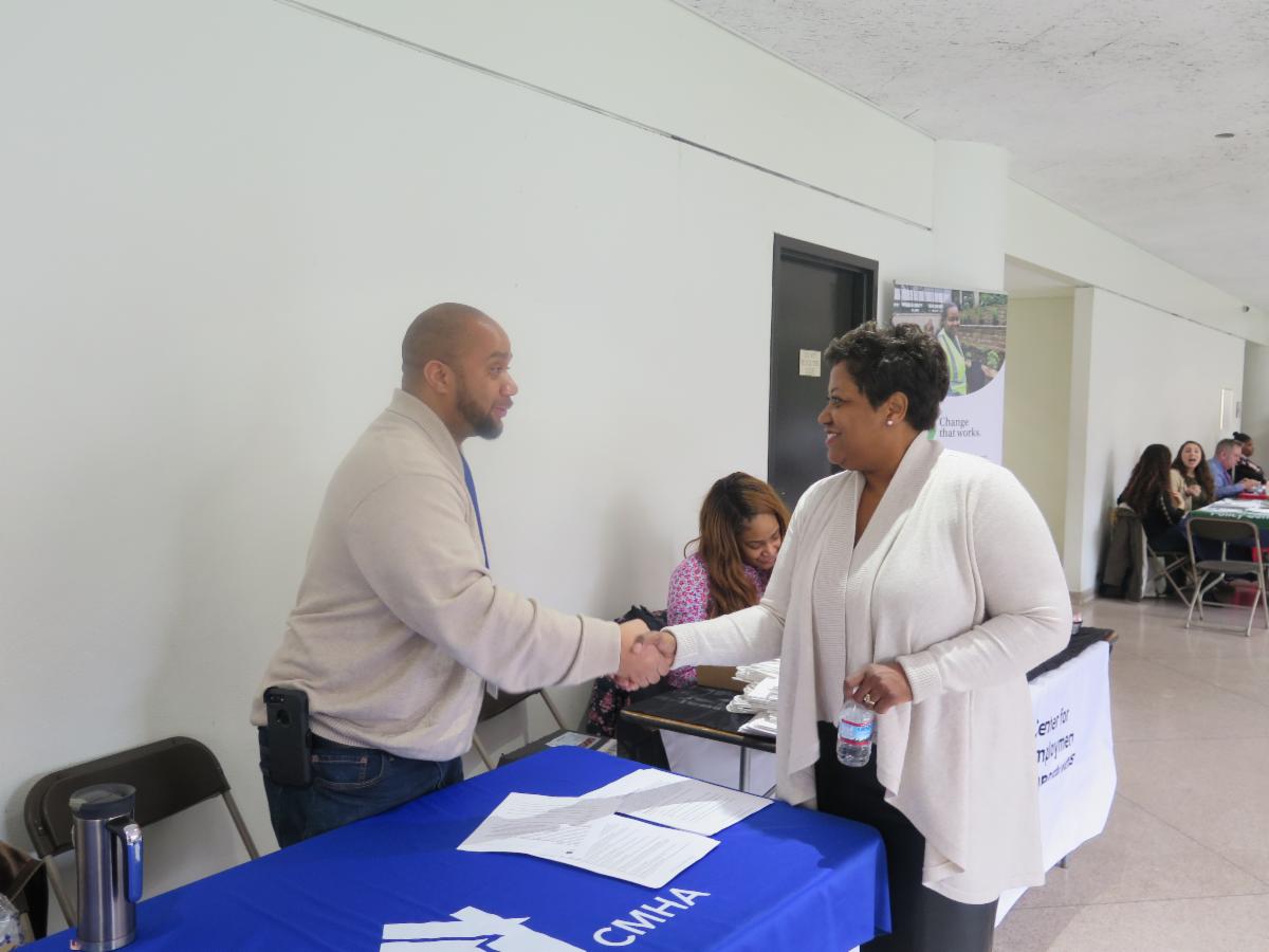 CMHA joined partner Hamilton County Office of Reentry for the monthly resource fair. The Hamilton County One-Stop Resource Center was created to eliminate barriers to accessing supportive services for all Hamilton County residents, including those with criminal convictions. Individuals seeking help related to housing, vital records, substance abuse and mental health care, child support and more are encouraged to attend the final Friday of each month. CMHA Assistant Property Manager Erick Packard attended this month to share information about housing opportunities at the agency.