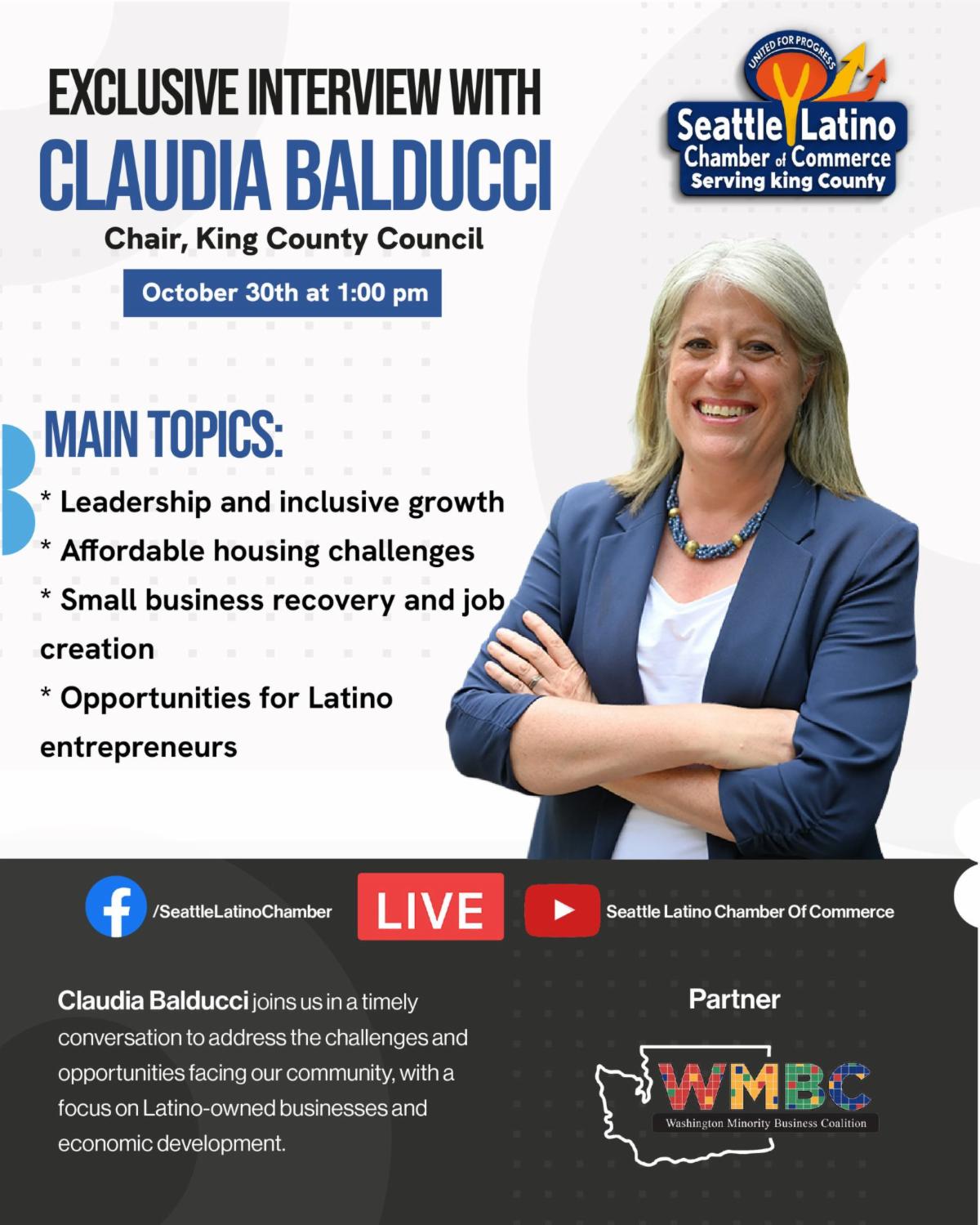 The Chamber conducted an exclusive interview with Councilmember Claudia Balducci, candidate for King County Executive. During the conversation, she shared her vision for economic development, strengthening minority-owned businesses, ensuring equity in public contracting, and advancing meaningful Latino representation within county government.