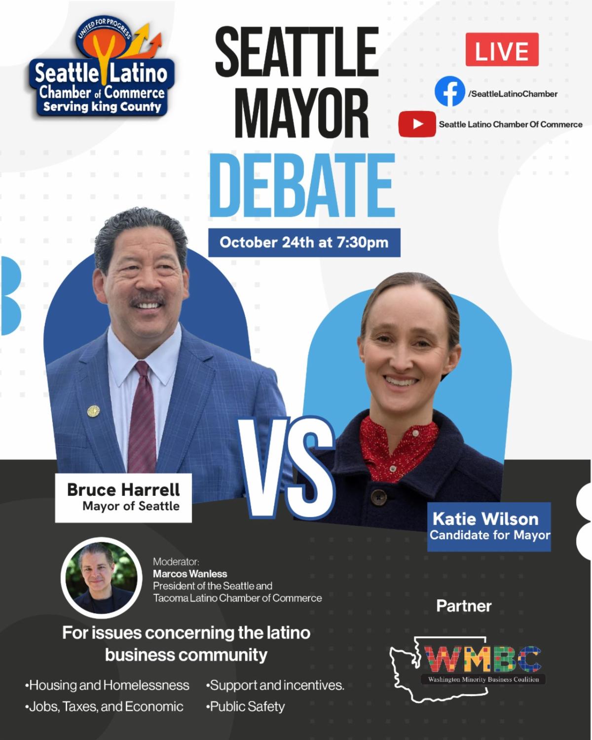 This forum featured candidates Katie Wilson and Mayor Bruce Harrell, who discussed issues essential to the Latino community, including economic development, public safety, housing, access to contracts, inclusion in decision-making, and the future of small businesses in Seattle.