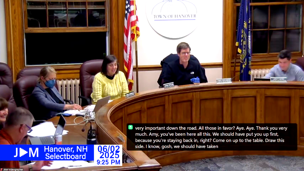 | | Pictured: Hanover Selectboard 6/2/25 | | This week's civic highlight: Watch the Hanover Selectboard discuss a logistics plan for street closur and the schedule of rates and fees. Tune into JAM's coverage of this or your town's government and school board meetings live or pre-recorded @ UVJAM.ORG/WATCH | | |