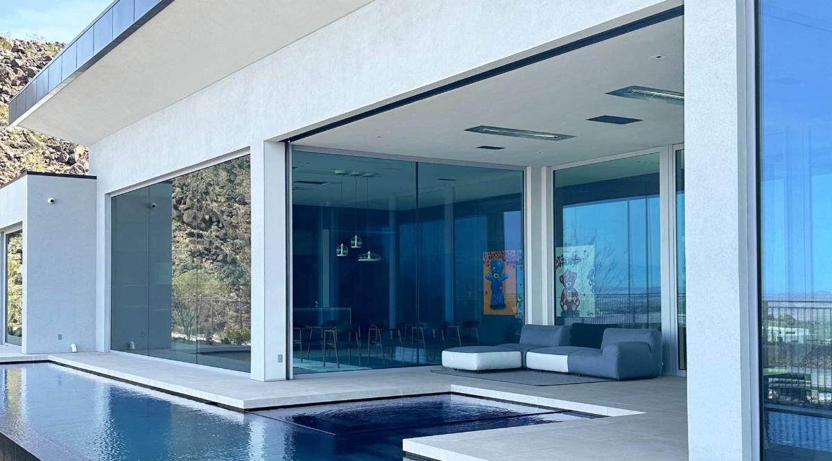 This desert home boasts 15 structural glass walls around the property, joining the outdoors with the indoors and creating a luxurious, expansive space.