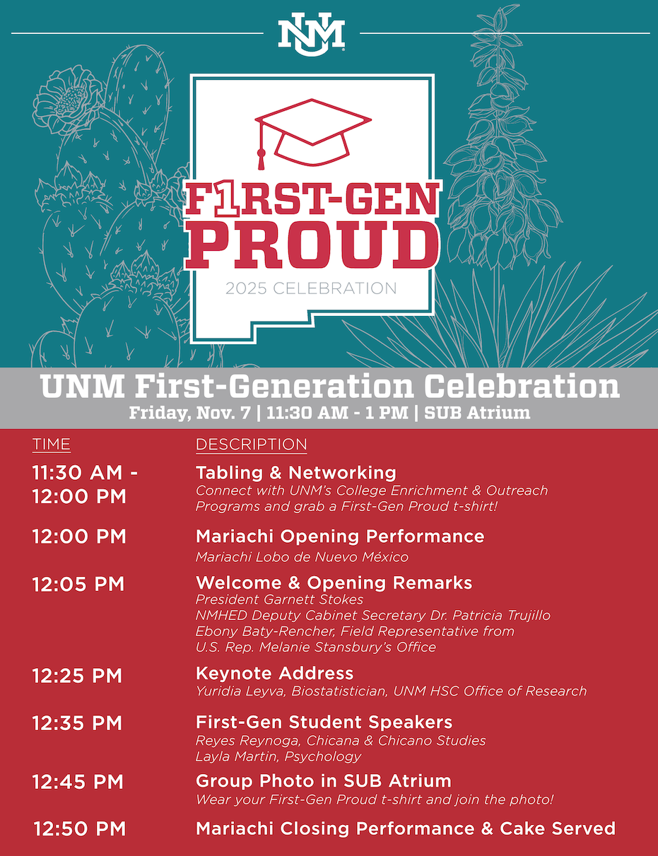 This week we recognize the members of our UNM community who are the first in their families to attend college. As a proud first-generation graduate myself, I recognize the challenges that navigating post-secondary education can pose for those encountering it for the first time. I also recognize the ways in which our backgrounds can offer assets such as caring support systems, strong work ethic, connections to family, cultural and linguistic values, and diverse worldviews.