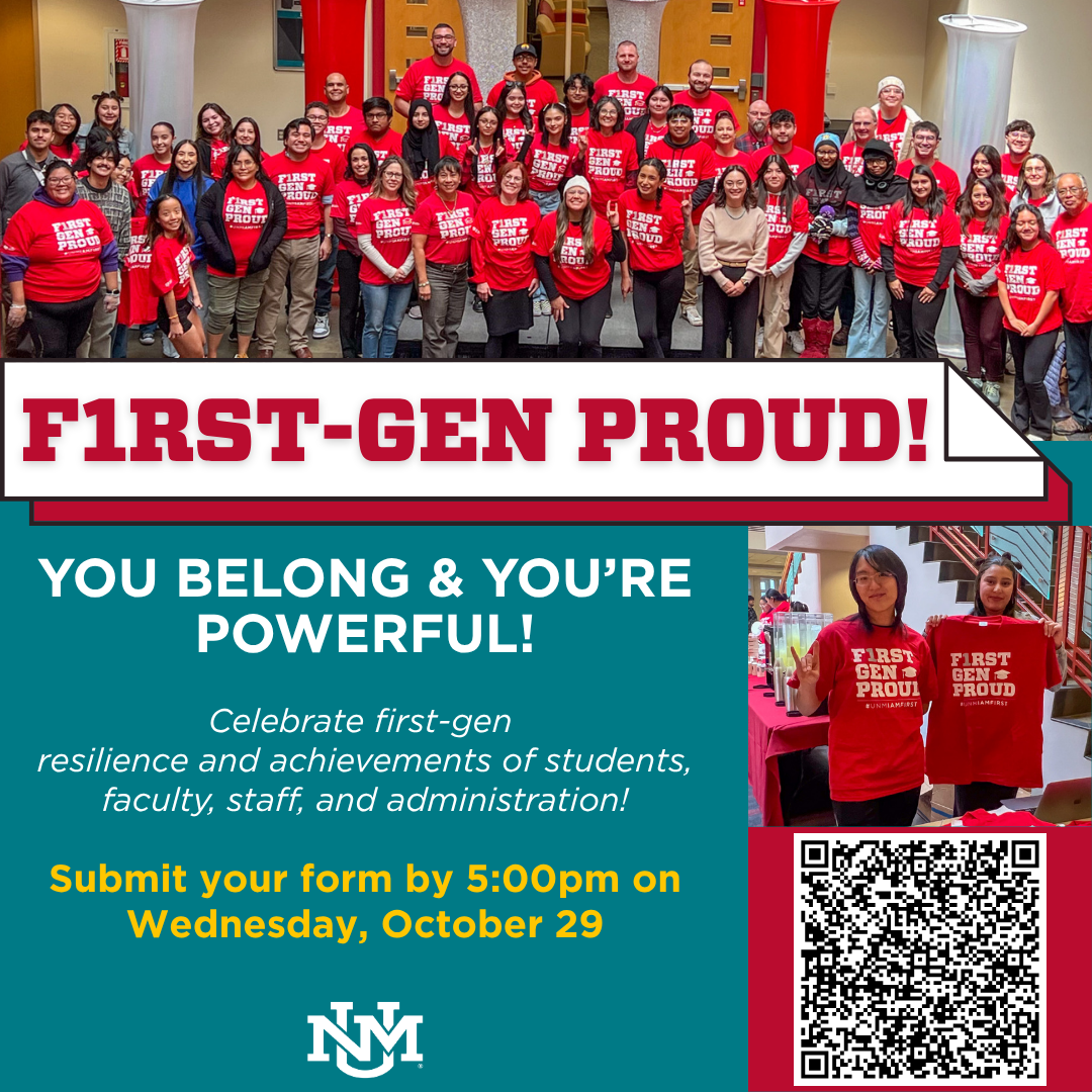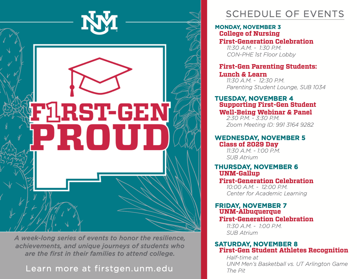 - Friday, Nov. 7: Main Campus First-Generation Celebration, SUB Atrium, 11:30 a.m. to 1 p.m., with remarks from UNM President Garnett Stokes; Dr. Patricia Trujillo, New Mexico Higher Education Deputy Cabinet Secretary; and a representative from Congresswoman Melanie Stansbury’s office. A group photo and cake will follow.