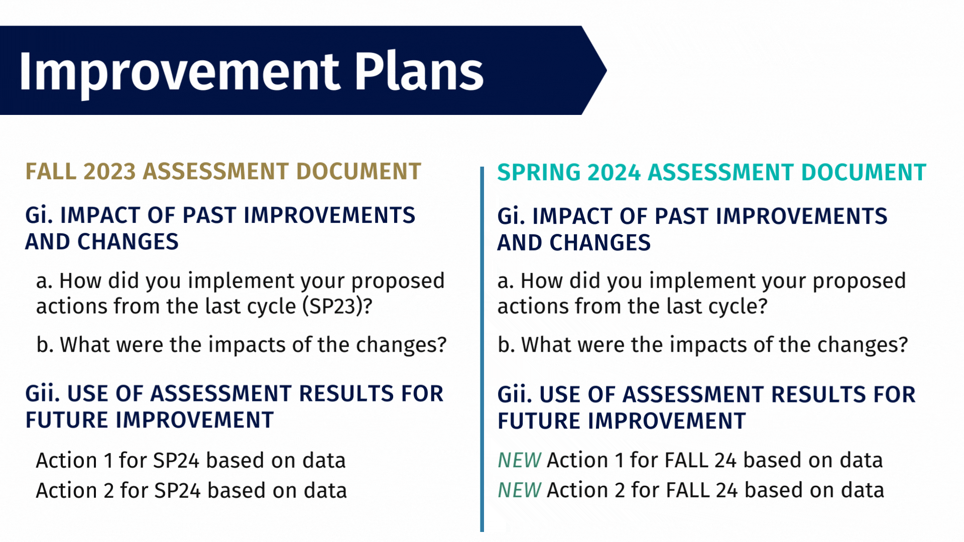 As a reminder, the due date for spring 2024 Student Services assessment document is Friday, May 31st. This date has been adjusted from previous spring deadlines to allow enough time for all Student Services assessment documents to be included in the 8.2.c. Compliance Certification for our SACSCOC Off-Site Review. Check out the Improvement Plans graphic below illustrating how the previous Use of Assessment Results for Future Improvement should be addressed in the spring 2024 Impact of Past Improvements and Changes section of the assessment document.