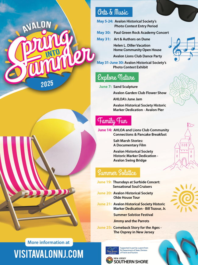 Avalon invites you to welcome the warmer weather at the 2nd annual "Spring Into Summer" celebration, running from late-May through the end of June. Every weekend, experience a variety of activities tailored to different themes, including Arts & Music, Explore Nature, and ending with the Summer Solstice Festival. Expect sand sculpture demos, Avalon's Art & Authors on Dune, and live performances by Jimmy and the Parrots. Families can also enjoy face painting, balloon art, and more activities for the kids. Join Avalon in welcoming another fun summer season.
