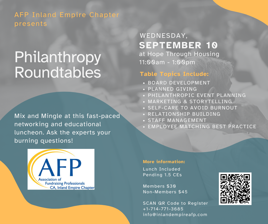 Philanthropy Roundtables: An opportunity to engage with your peers in meaningful discussions around the current trends and challenges in our field. Join us September 10th for this fast-paced networking and educational luncheon.