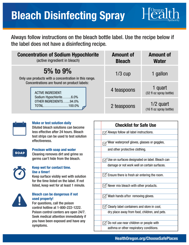 Chemicals found in cleaning, sanitizing, and disinfecting products can be hazardous to health if they are not used properly. Children are particularly vulnerable to potential health effects from chemicals in these products. Please be sure you are using each product per the instructions on the label. Oregon Health Authority has created a toolkit with articles and videos to support in the safe and proper use of these products.
