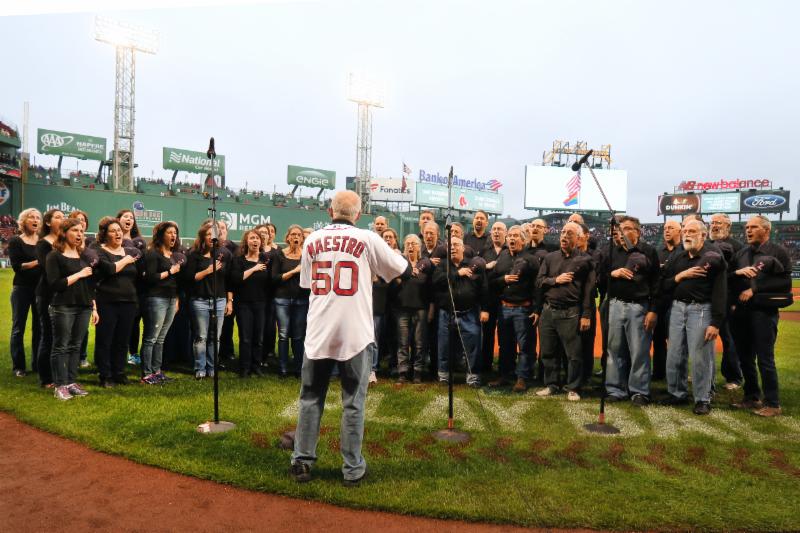 As part of Jewish Heritage Night, on Thursday, June 13, members of the Zamir Chorale were extremely honored to perform the national anthem during the festive pre-game ceremonies at chilly, drizzly Fenway Park in Boston. The Red Sox played the Texas Rangers and, no doubt bolstered by Zamir's indomitable spirit (!), came back from a 6-1 deficit to win 7-6. Special thanks to chorus president Rachel Miller for making Zamir's appearance a reality. Go Sox!